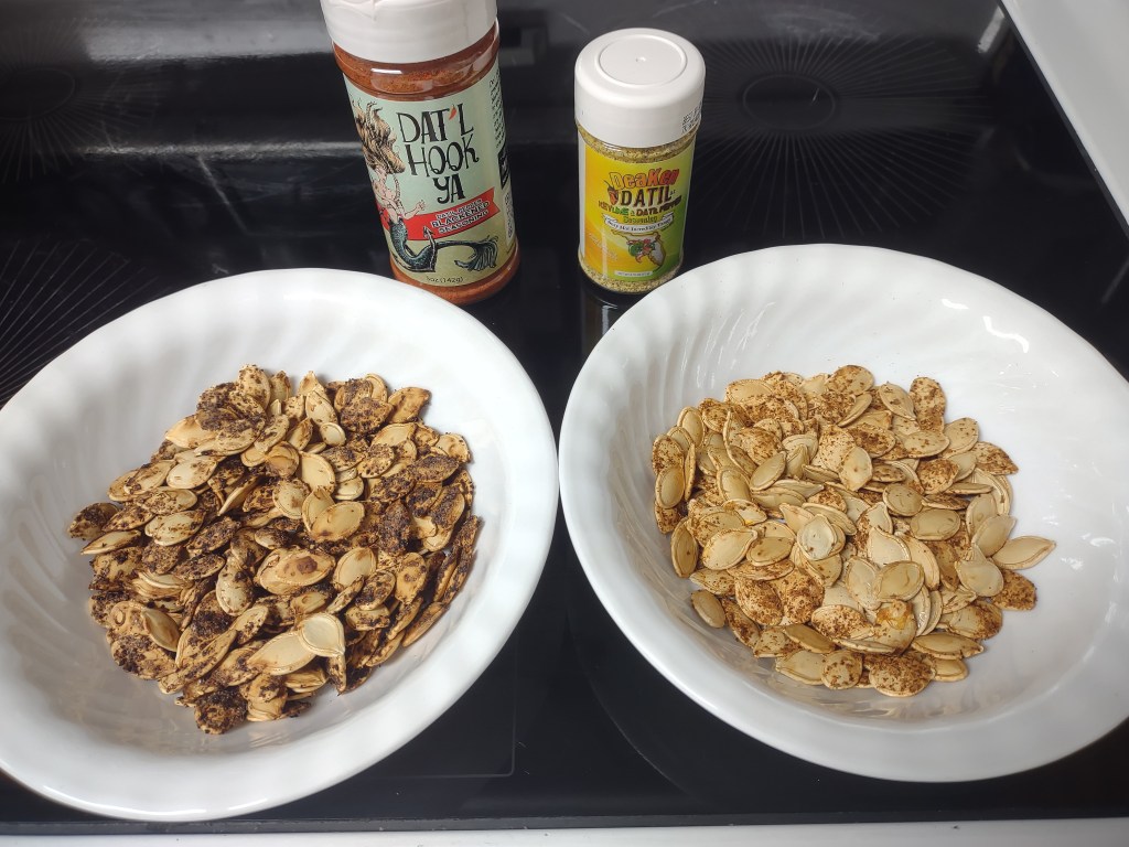 I love making flavored pumpkin seeds and the kids have fun scooping them out of pumpkins. 🎃 Win, win! I decided a new Datil flavored batch of pumpkin seeds sounded like fun. I ended up making 2 small batches to see how they would turn out. We used the Deaken Datil and Dat’l Hook Ya seasoning blends. The Deaken Datil had a nice key lime zing with it, but definitely not overly hot. I like salty pumpkin seeds, so I will add some sea salt to the seeds next time, but we really enjoyed the flavor. The Dat’l Hook Ya had a nice deep paprika flavor and no additional salt was needed and it had a bit more heat to it, which added a different kind of kick. Both were delicious and I’ll definitely be making more! 😋