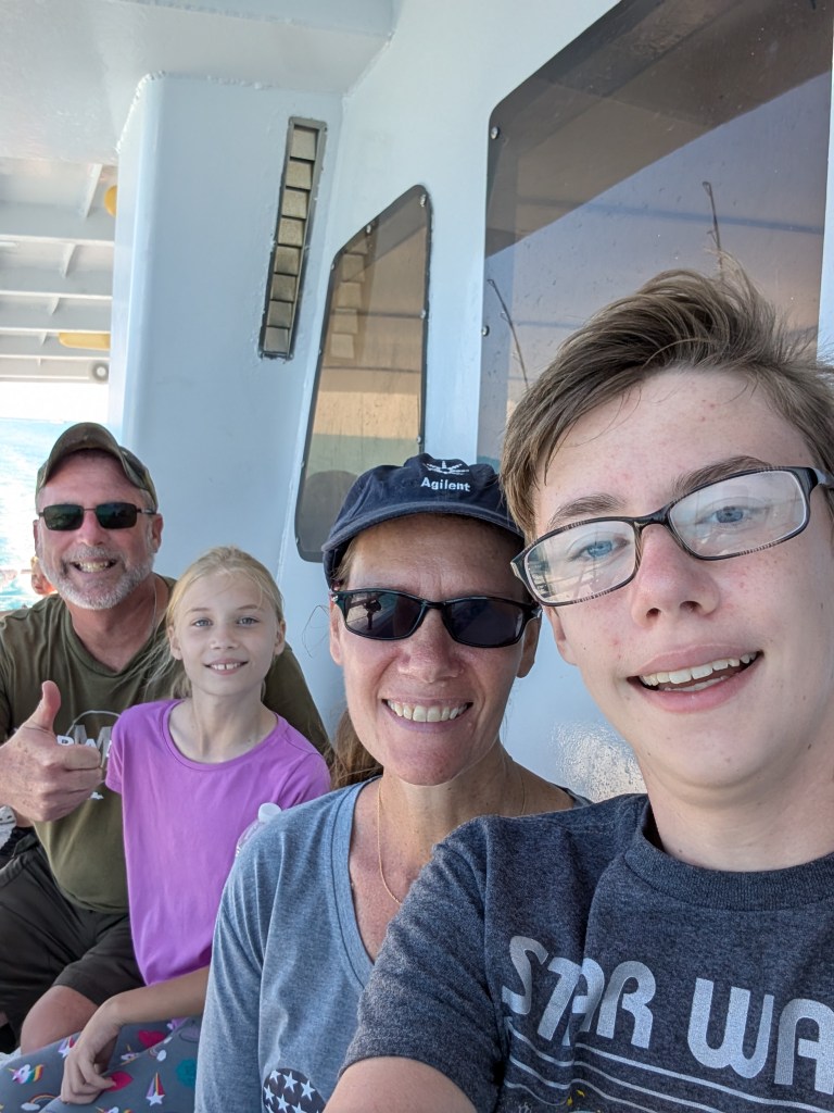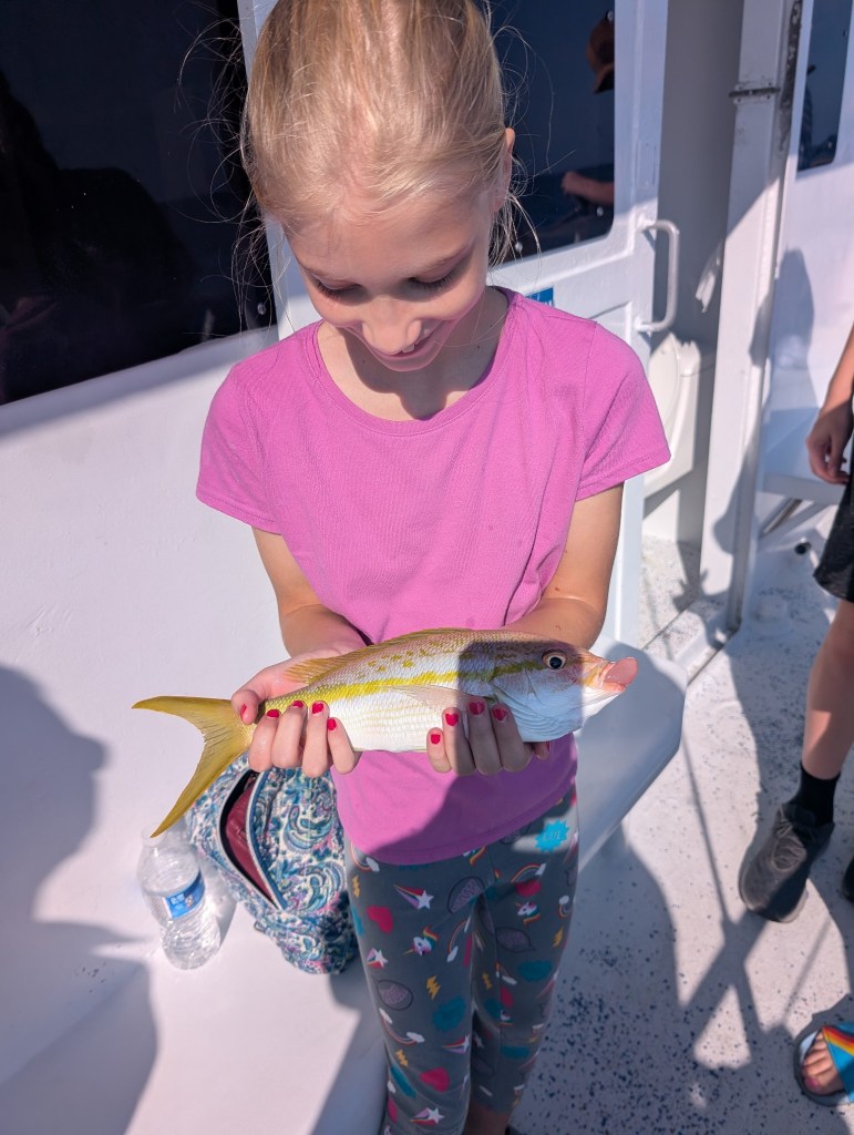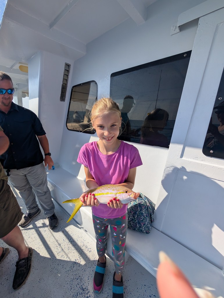 Once it was time to board the boat, we were given a safety lesson and took a seat to enjoy the ride. The boat had open upper level seating and air conditioned enclosed lower level seating where you could view the ocean through the glass bottom panels. On the ride out to the reef, we chose to stay inside so we could see the underwater ocean life. It was pretty neat! When we made it to the reef, we were really excited! It was cool to be able to see the ocean floor and reefs we had been fishing the day before. We enjoyed seeing the fish, too. We saw all kinds of different reef fish, some sea turtles, a spotted ray, and beautiful coral formations. 🪸
