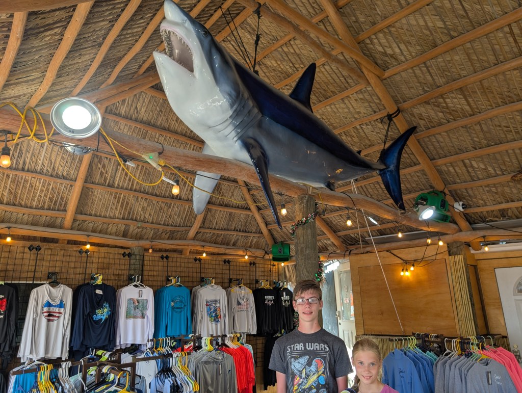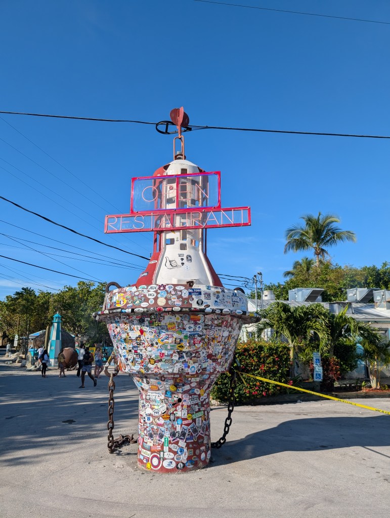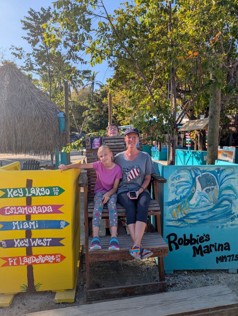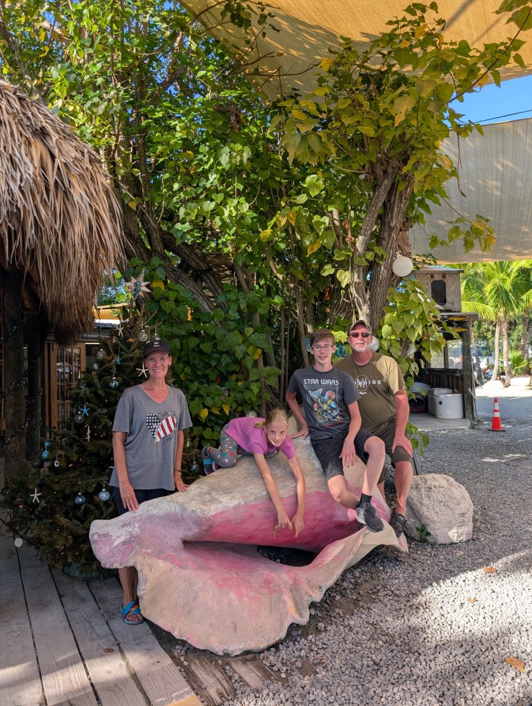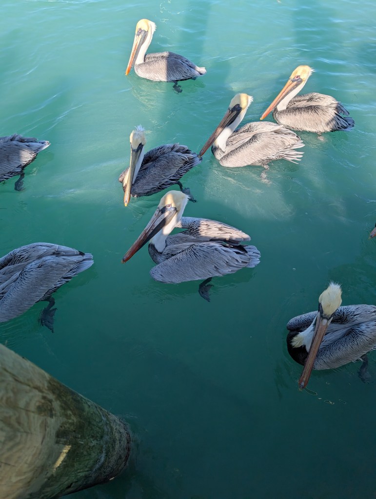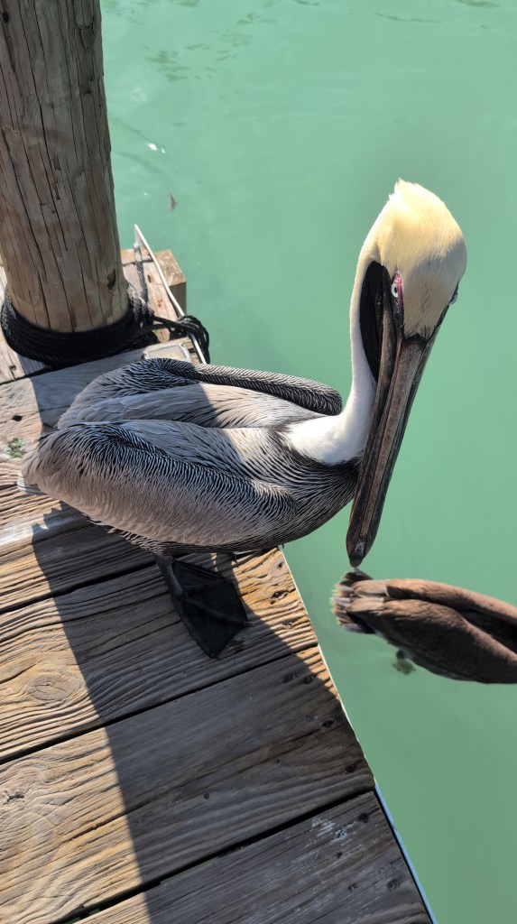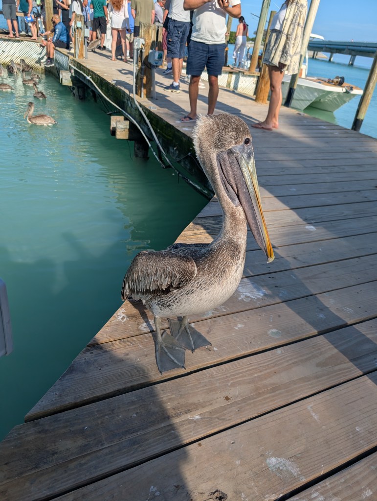 We had been to Islamorada before, so we knew we wanted to go back to feed the tarpon at Robbie’s. There were quite a few vendors and restaurants in that area, so we wound through them to get to Robbie’s. Things have definitely changed in the last 5 years. 🤯 The last time we were there you could feed the tarpon anywhere on the docks, but now there is an area you needed to utilize to feed them. In the new area between the docks, there is now netting with hand holes. I’m sure it’s for safety or to prevent you from losing your phone, but it was really hard to get close enough to hand feed the tarpon–or to get decent pictures. 😏 However, I did put my phone through the holes to get a picture of this adorable manatee that kept swimming by! He was so stinking cute!!! 🥰 The pelicans were also pretty adorable–even if they did steal the fish we bought to feed the tarpons. 😂 🐟