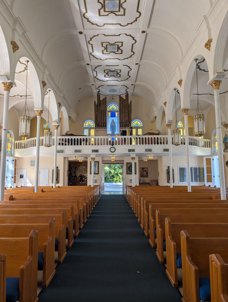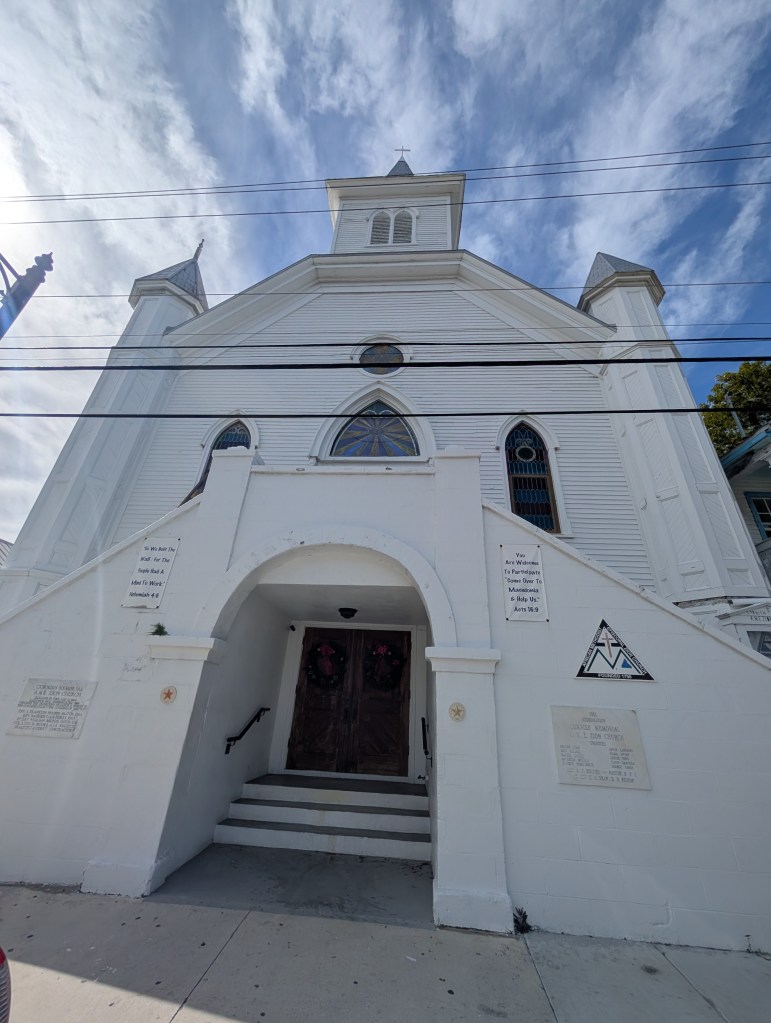 Our final stop was the Basilica of St. Mary Star of the Sea. ⛪ This Catholic church is the home to some pretty fascinating history. A brief bit of history–in 1846 the first Catholic Mass was said in Key West. Saint Mary Star of the Sea was built and in 1852 the church was dedicated. However, in 1901 that church was burned down (suspected arson). 😞 Most of the objects were lost in the fire, and according to their website, “Although many valuable objects were rescued from the Church before the fire forced the men out, much was lost. From the debris of the fire were salvaged a few candlesticks and Stations of the Cross, all badly burned. One exception was a crudely painted plaque depicting the Virgin Mary as Star of the Sea with the following inscription: