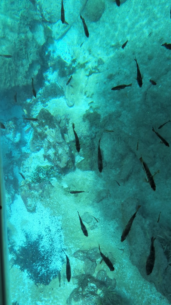 On the glass bottom boat tour, we rode over the most beautiful, crystal clear, turquoise water. The bottom was over 35 ft. deep and we could still see it clearly. It looked closer to 5 ft. deep! We watched the tilapia and other fishies swim, viewed the creature’s cave from the Creature from the Black Lagoon, and watched the water bubble up from the springs below. Our favorite was watching the soft-shelled turtle look around below us.