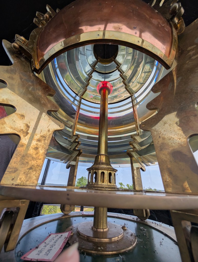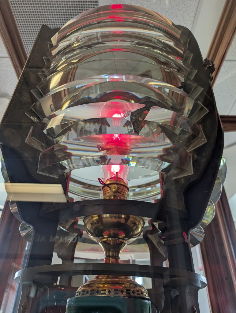 Judy was the lighthouse guide the day we arrived, and she was amazing! She was very friendly and gave us a lot of information about the lighthouse. We were super excited, so we made our way to the steps to give the lighthouse a climb. Sand Point was unique! When you first enter the lighthouse, you climb a flight of stairs to the main floor of the keepers quarters. You can either go view the main floor or go up another flight, that takes you to the second floor of the keepers quarters. Then there is another flight of stairs that takes you to the top of the lighthouse where you enter the lantern room. We decided to go to the top first and visit the different floors on the way back down. I was impressed with the set up of the lighthouse, because the keeper would only need to climb the top flight of stairs to refill the lantern at night instead of having to climb the full set of steps. Work smarter, not harder! 😉