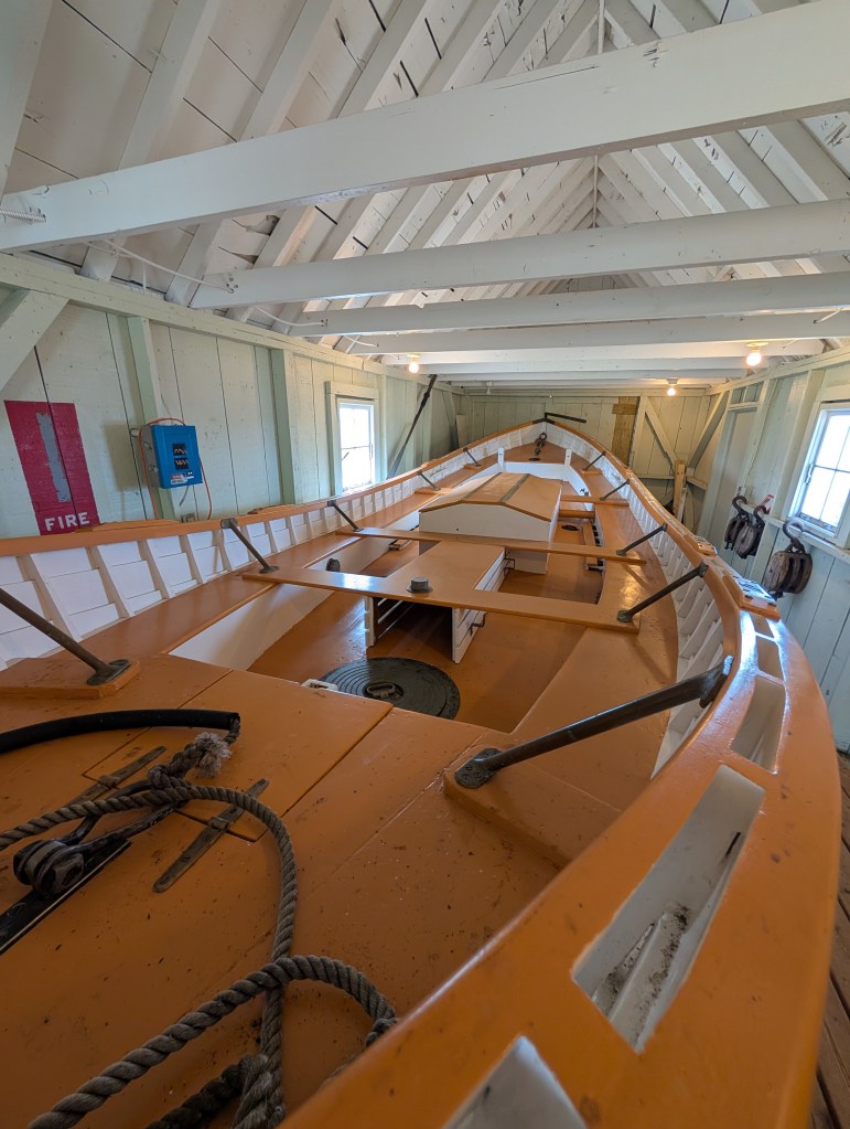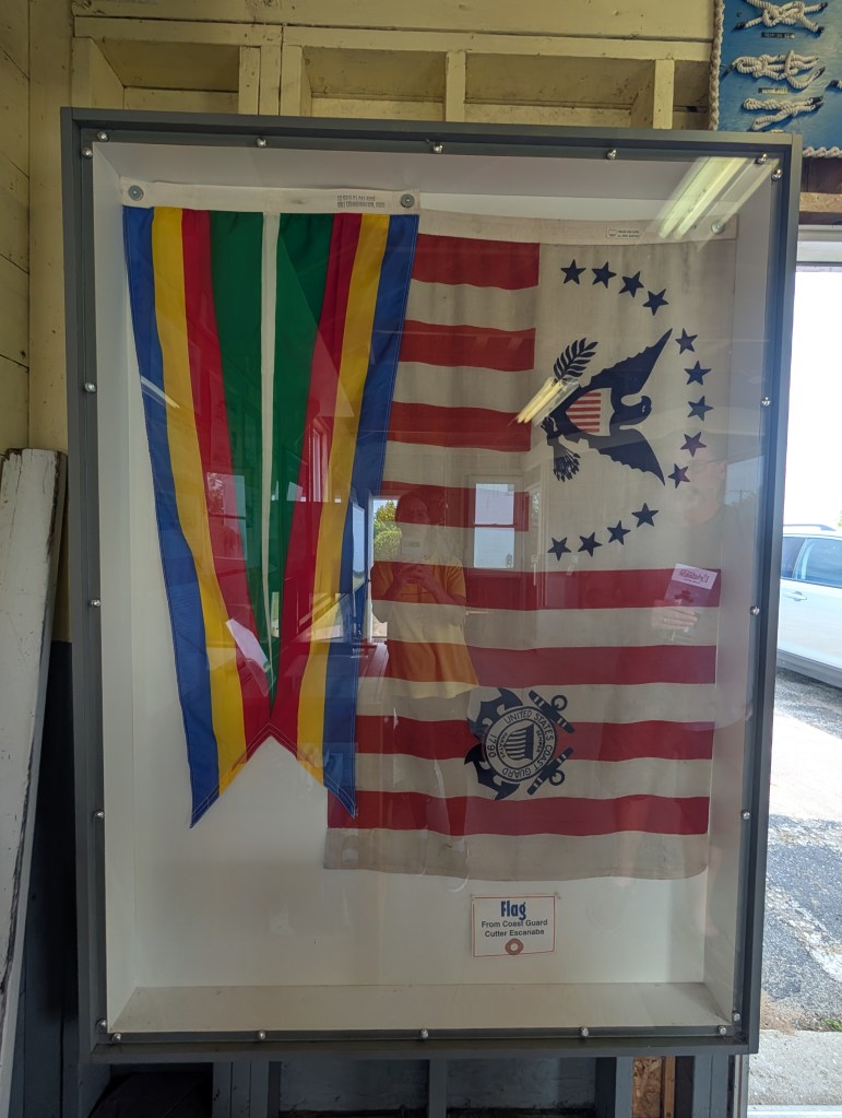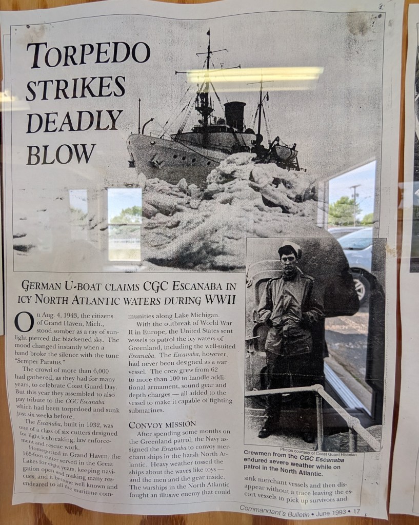 After we toured the living quarters, we wandered to the boathouse to learn about the CGC Escanaba. The Coast Guard Cutter Escanaba was sent to guard the waters of Greenland during WWII. The CGC Escanaba was not designed for war, and unfortunately was destroyed by a German torpedo. Only 2 of the 105 crew survived.