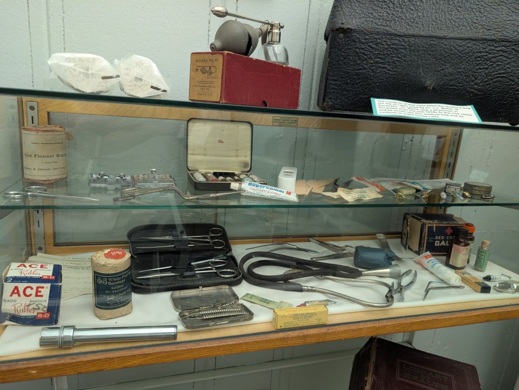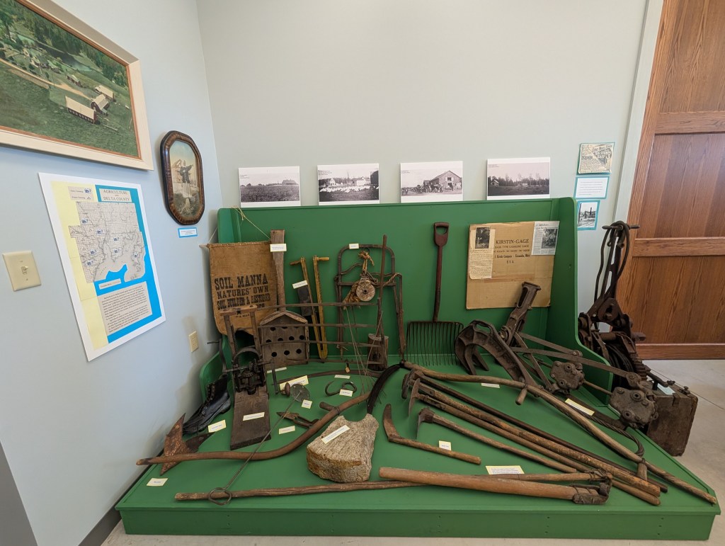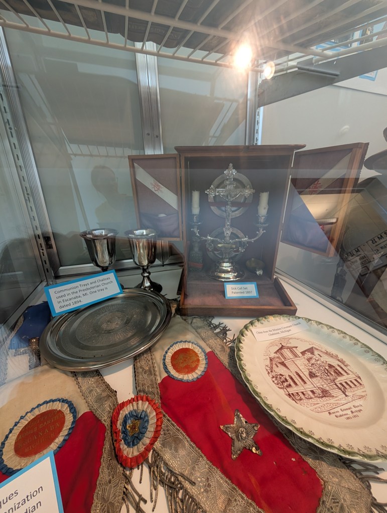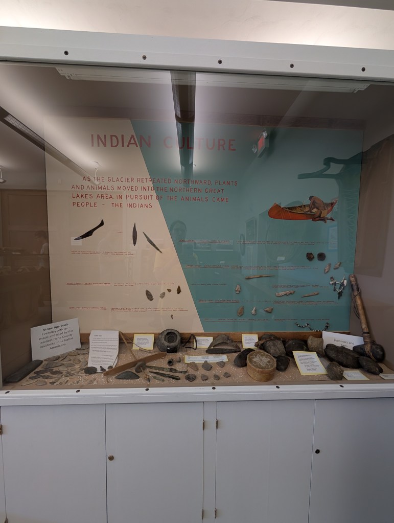 The next place on our list of things to see was the Delta County Historical Society Museum. We were so delighted to find this hidden gem! It is filled with the most amazing memorabilia! We have paid quite a bit more to see museums that did not hold a candle to this one! We saw the original fourth order Fresnel lens that was housed in the lighthouse. There was an antique bicycle, dollhouse, gun/sword collection, and a Bible from 1889 with a Catholic sick call set! Antique dentist and doctor furniture with their implements were on display with a barber’s chair & equipment. There were even fig flavored Ex-Lax! 😄