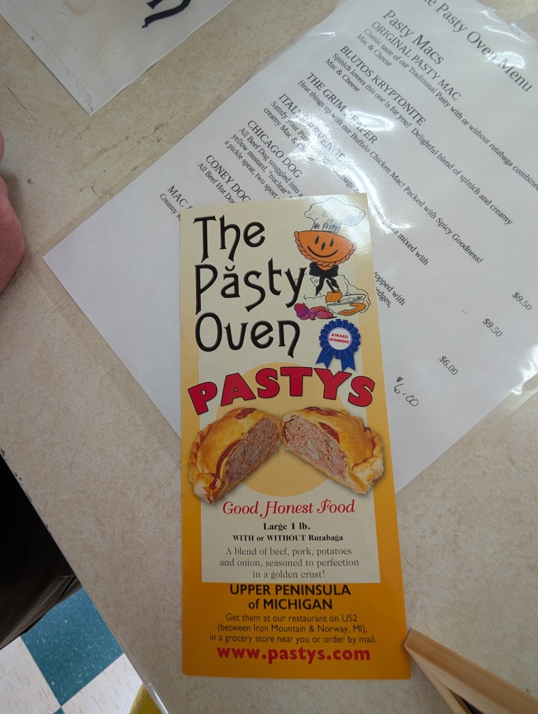 After this extensive history lesson, we needed to grab a bite to eat. We like to eat healthy, and we love the history of pastys that the local miners used to eat, so we decided to take a quick drive. There are many pasty restaurants in the U.P., but my favorite is The Pasty Oven in Quinnesec. The crust is delicious and the filling is scrumptious! Filled with a mixture of beef and pork, it also has potatoes, onions, and rutabagas. You can opt to have them without the rutabaga, but we love them! They also have a selection of specialty pastys, and the spinach & cheese one is fantastic! If you’re interested in my favorite comfort food, you can check them out here: https://pastys.com/