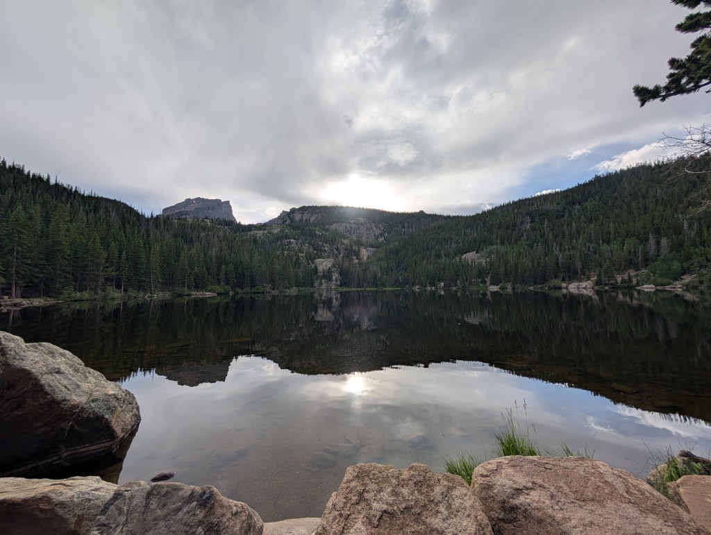 The weather started clearing up and the reflection of the trees on the lake was absolutely stunning.