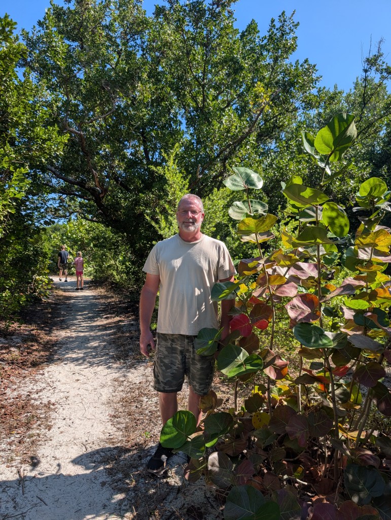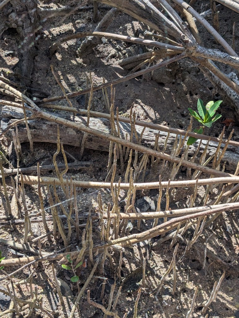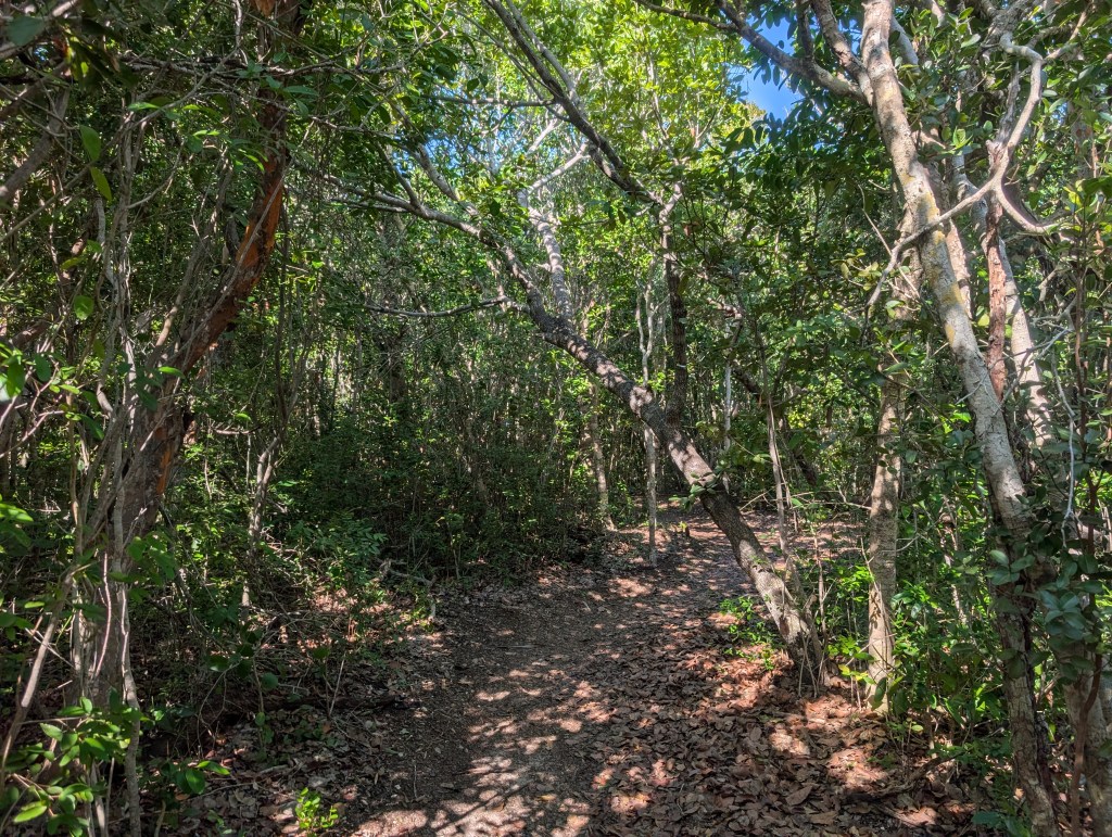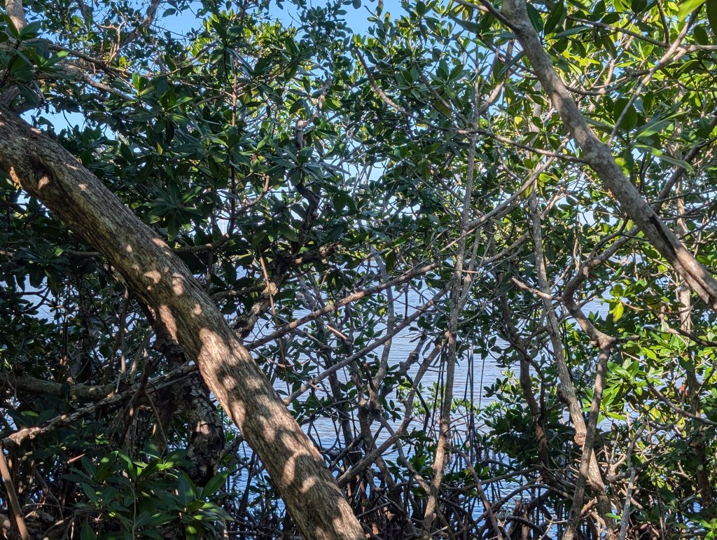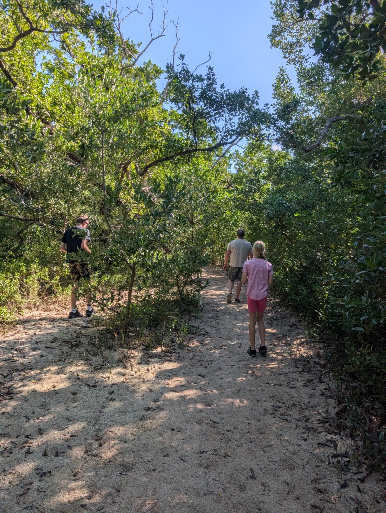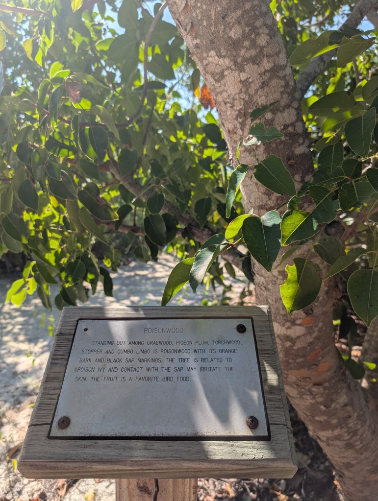 In the Mangrove Swamp, there were lush mangrove trees in addition to some other interesting vegetation such as gumbo limbo, pigeon plum, and crabwood. We were a bit surprised to learn about poisonwood. This is a tree with orange bark and black sap marks. According to the sign the park installed, “The tree is related to poison ivy and contact with the sap may irritate the skin.” We definitely stayed away from that one!