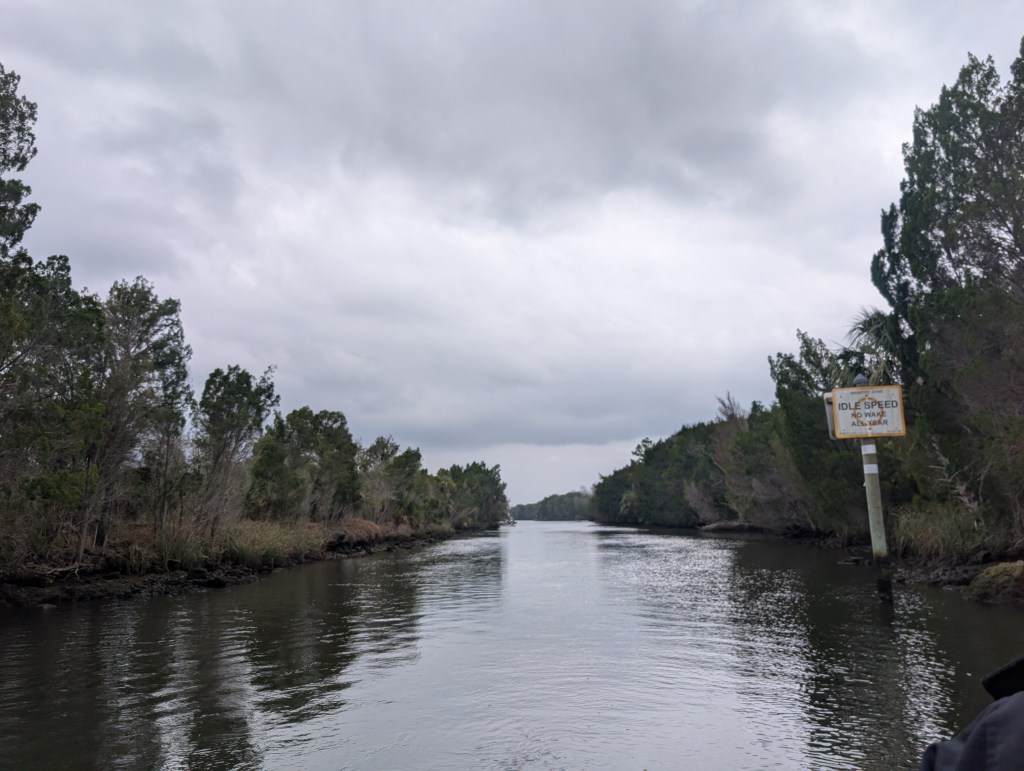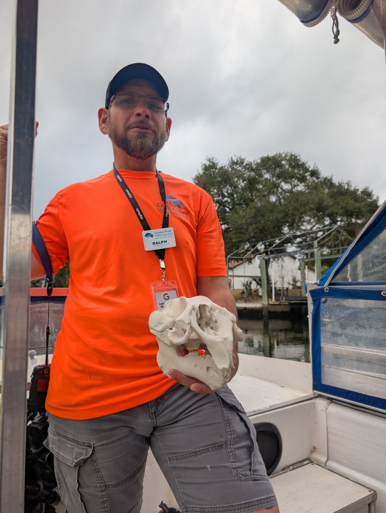 Once we were ready to go, we boarded the boat and were off on one of the most amazing adventures we could hope for. While we were cruising down the channels, Ralph taught us about the manatees. We were able to hold a skull replica and view the eye sockets, nasal cavity, and their teeth. Did you know that manatees have an everlasting set of teeth? When one is ground down and no longer useful it falls out and a new one pushes up from the back, which moves the rest of the teeth forward. How cool is that?