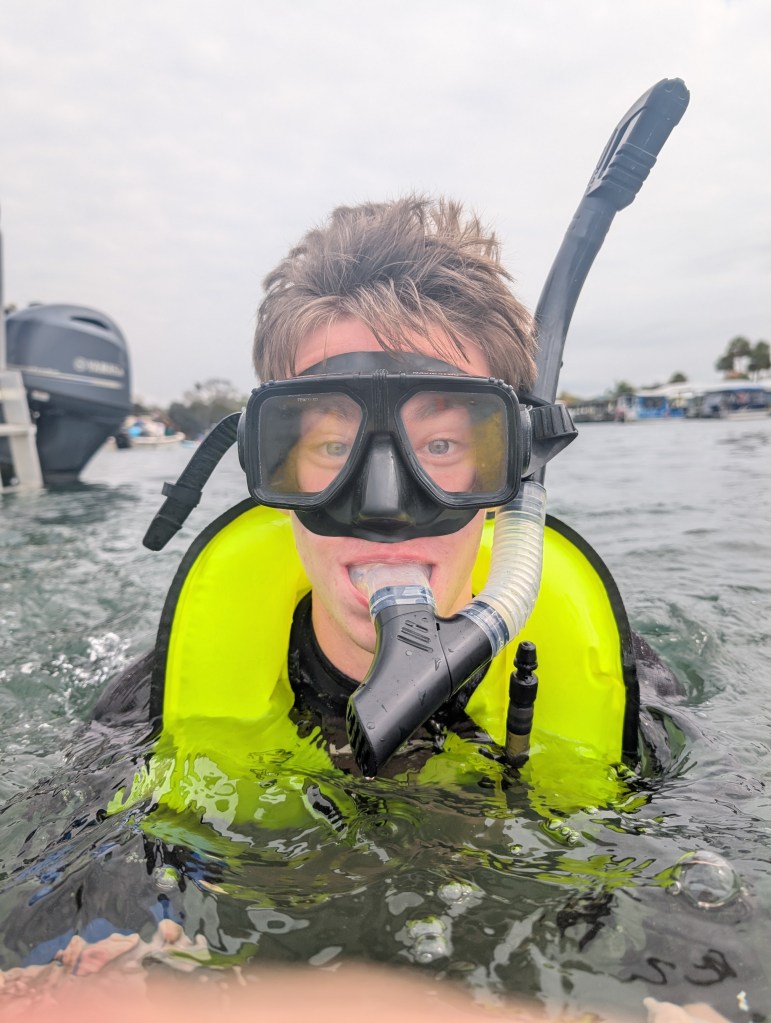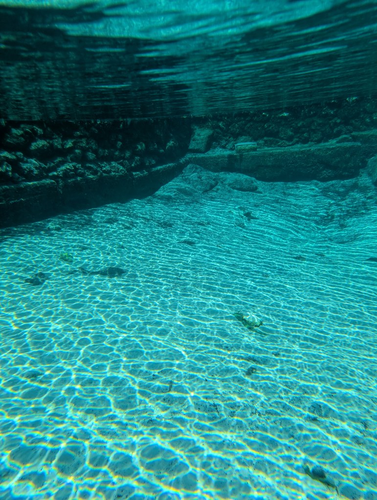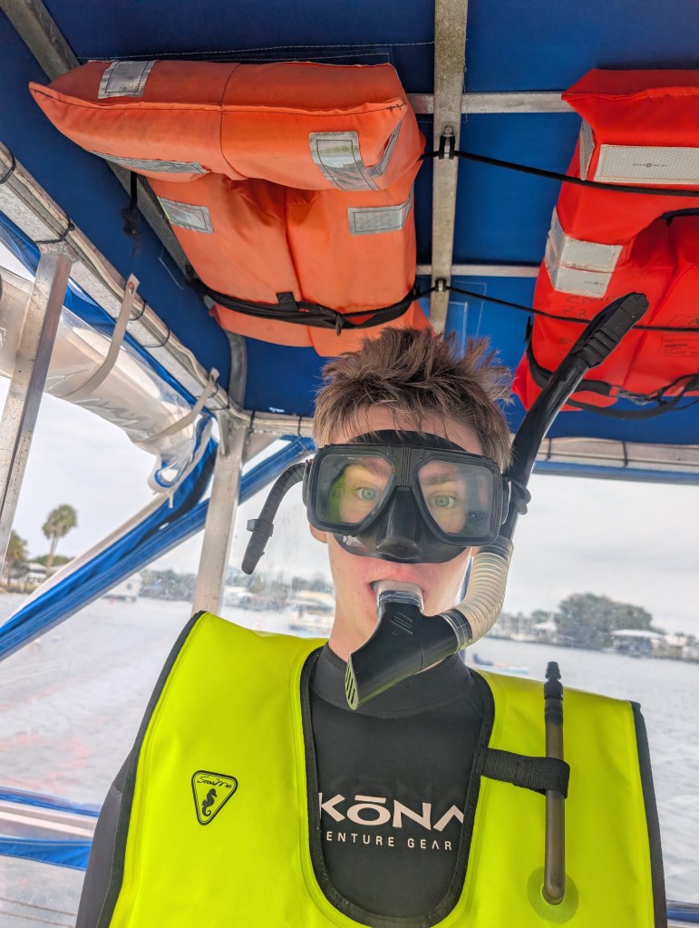 On our way to go diving, we were handed our mask and snorkel. (If you’re wondering, they do get sanitized between uses.) They showed us the proper way to put them on, and we were ready to go. Once we made it to the dive site, all of us were very excited and ready to see a manatee! Now Luke and Juliana had never snorkeled before, and I haven’t snorkeled since I was about 10 years old, and that was in a pool, so we definitely needed a bit of time to adjust. Everyone was very patient with us and made sure we felt comfortable. We really need to hand it to the kids for being so brave and stepping out of their comfort zones. Luke adjusted rather quickly, and after a bit, Juliana was able to put her face in the water and swim around like everyone else in the group.