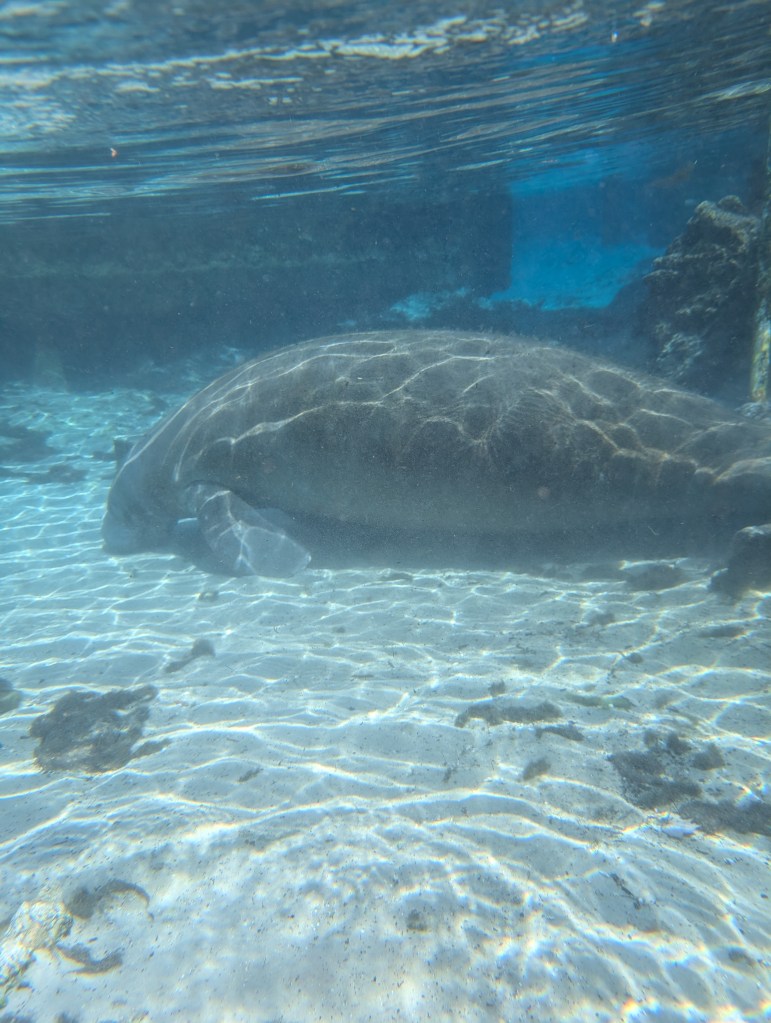 If you’ve ever seen a manatee before, you can tell they are pretty large. We were so intrigued about how large they can get, we wanted to do some research. According to https://dolphins.org/manatee_factsheet, “Manatees are about 4-4.5 feet (1.2-1.4 m) long when they are born and average 60-70 pounds (27-32 kg). Full-grown manatees weigh between 800 to 1,200 pounds (360-545 kg) and reach 10 feet (3.0 m) in length. They can grow to be as large as 3,500 pounds (1590 kg) and 13 feet (4.0 m) in length (Ridgeway 1985).” You can tell they are pretty large when you see them from above, but actually being underwater swimming a few feet away from them, you feel dwarfed in comparison. These things are huge!