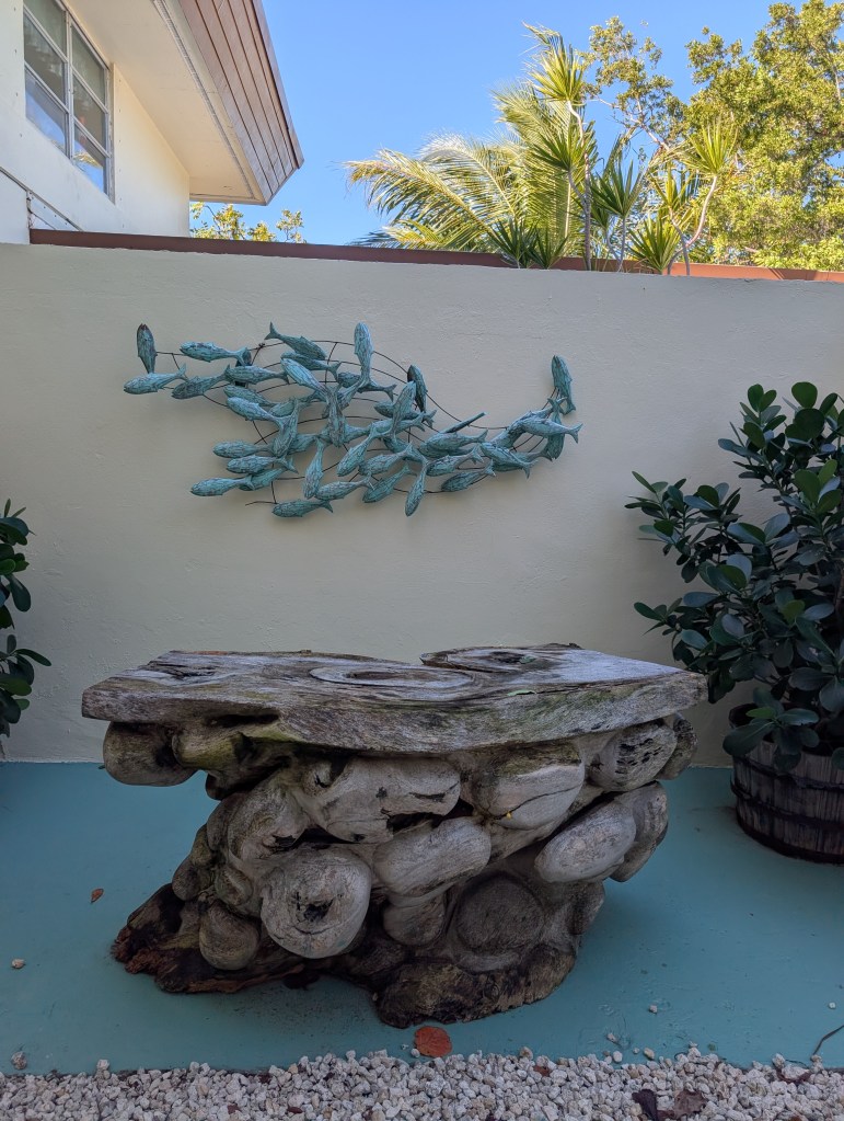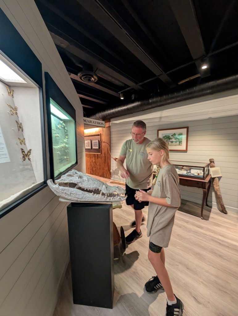 Before we went into the museum and nature center, we wanted to stop and learn about the railroad car out front. We were excited to learn about the history of Marathon. In 1908, Marathon began as a stopover and shipping terminal for the Flagler Railway. Juliana was intrigued since she learned about the Flagler Railway last year in history. It was interesting to learn that Marathon was the construction headquarters while the Seven Mile Bridge was built to transport people and supplies to Key West. I thought it was super cool to see the Golden Orb Weaver spider that we tried to find at Long Key State Park, but were unsuccessful. We also enjoyed seeing the beautiful flowers growing.